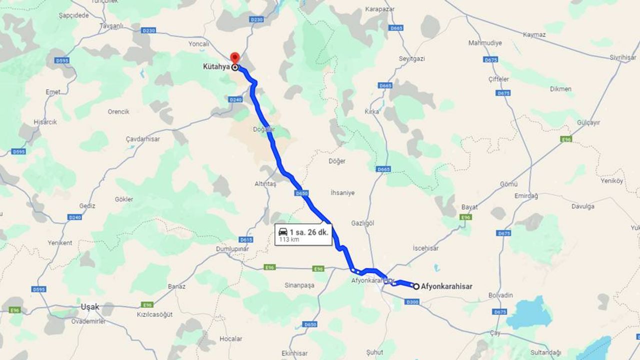 Özel araçla yapılan yolculuklarda Afyon–Kütahya arası seyahat süresi ortalama 1,5 saat sürmektedir.