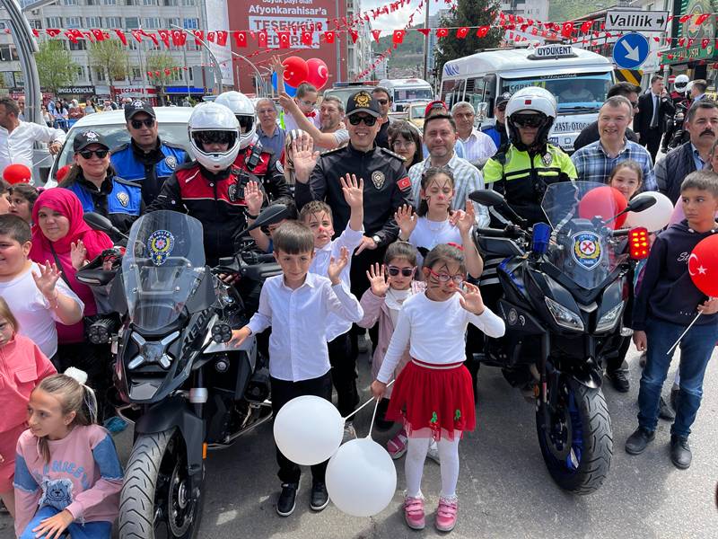 Zafer Meydanı’ndan başlayan konvoy, Afyonkarahisar Valiliği önünden geçerken Vali Kübra Güran Yiğitbaşı çocukları selamlayarak uğurladı. Ardından çocuklar, Emniyet Müdürlüğü Çevik Kuvvet Şube Müdürlüğü’nde düzenlenen etkinlikte ağırlandı. Burada Emniyet Müdürü Ahmet Birtan Erol, çocuklara polis şapkası hediye etti.