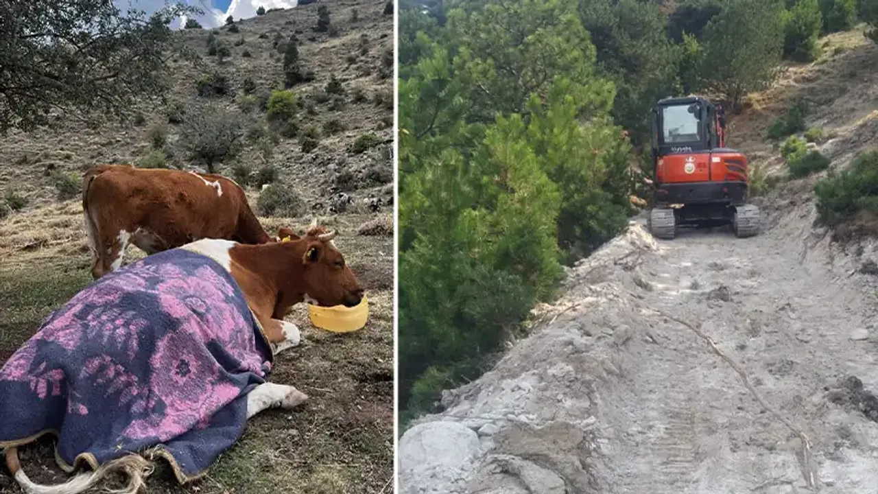 Afyonkarahisar'ın İscehisar ilçesine bağlı Çatağıl köyünde, eğimli bir arazide yuvarlanan inek için kapsamlı bir kurtarma operasyonu gerçekleştirildi.
