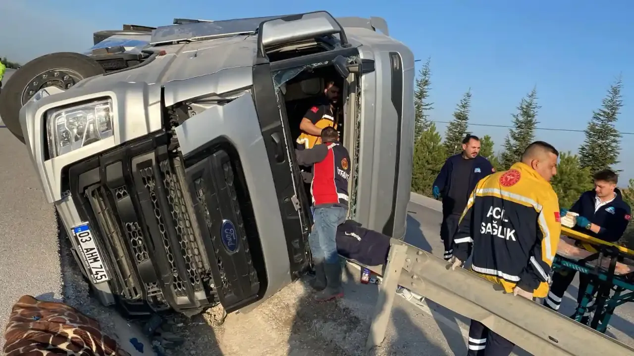Afyonkarahisar'ın Emirdağ ilçesine bağlı Ümraniye köyü yakınlarında sabah saatlerinde yaşanan trafik kazasında, 03 AHM 745 plakalı tır refüje devrildi. Tırın sürücüsü M.D. (36) ile araçta yolcu olarak bulunan A.Ç. (39), kazada yaralandı.