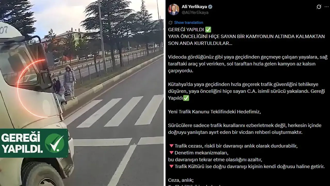 Bakan Yerlikaya, “Gereği yapıldı” başlığıyla yayınladığı açıklamasında kadın ve çocuğun yaya önceliğini hiçe sayan bir kamyonun altında kalmaktan son anda kurtulduğunu bildirdi.