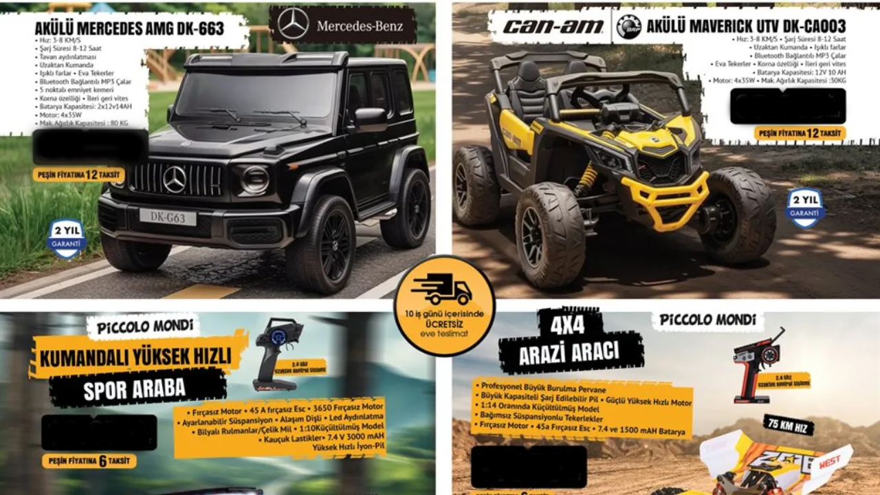 Mercedes AMG dışında BİM'in 23 Temmuz afişinde 3 farklı akülü araç modeli daha yer aldı. Her biri farklı yaş gruplarına hitap eden bu araçlar, hem oyuncak severler hem de çocuklu aileler için cezbedici seçenekler sunuyor.
