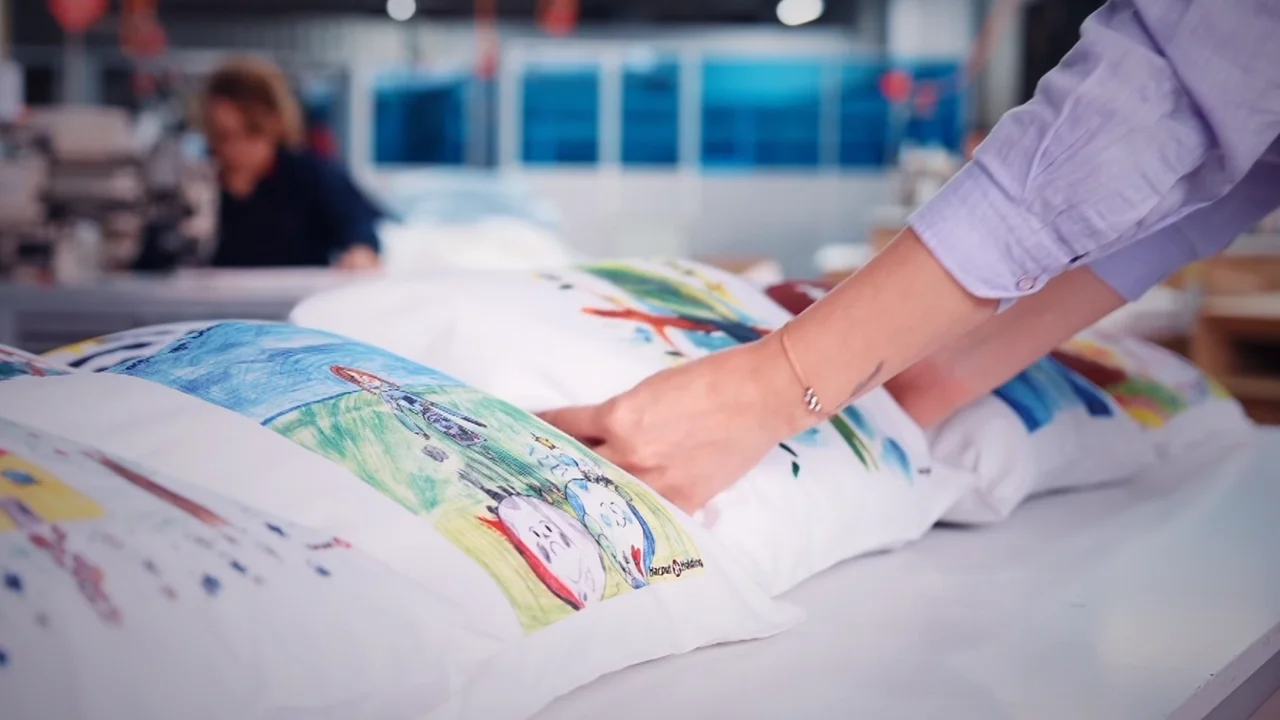 “Düşlerden Geleceğin Tekstiline” adlı proje çerçevesinde çalışanların çocukları tarafından çizilen resimler, tekstil fabrikasında işlenerek yastık kılıflarına dönüştürüldü.