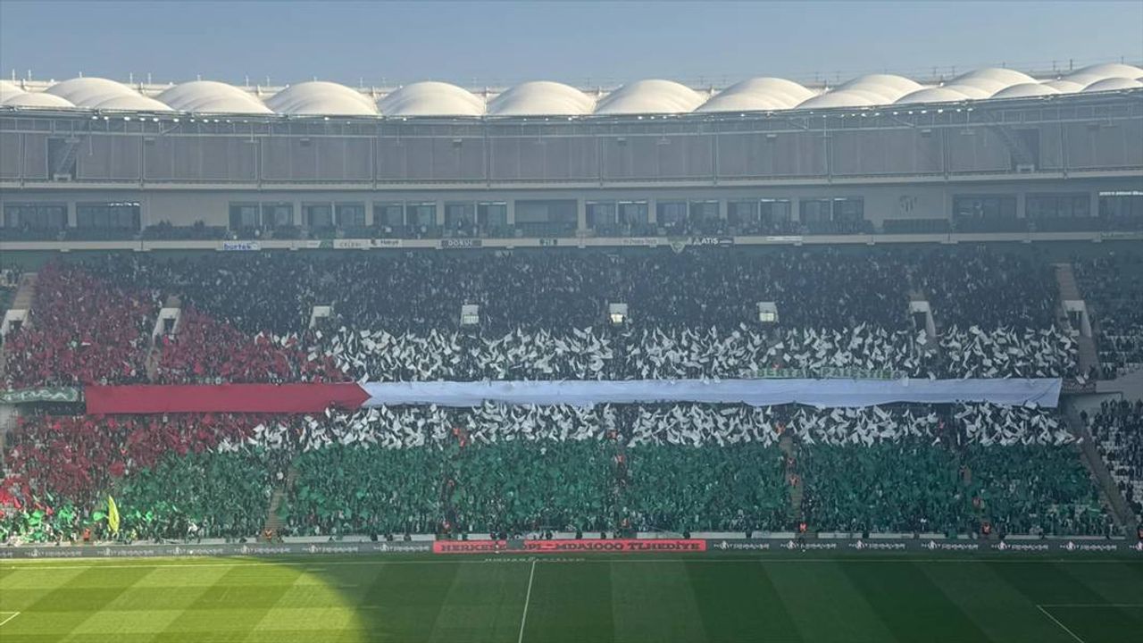 Bursaspor taraftarları, Nesine 3. Lig'in 20. haftasında oynanan Anadolu Üniversitesi maçında İsrail’in Filistin ve Lübnan’a yönelik saldırılarına tepki göstererek tribünlerde protesto düzenledi.