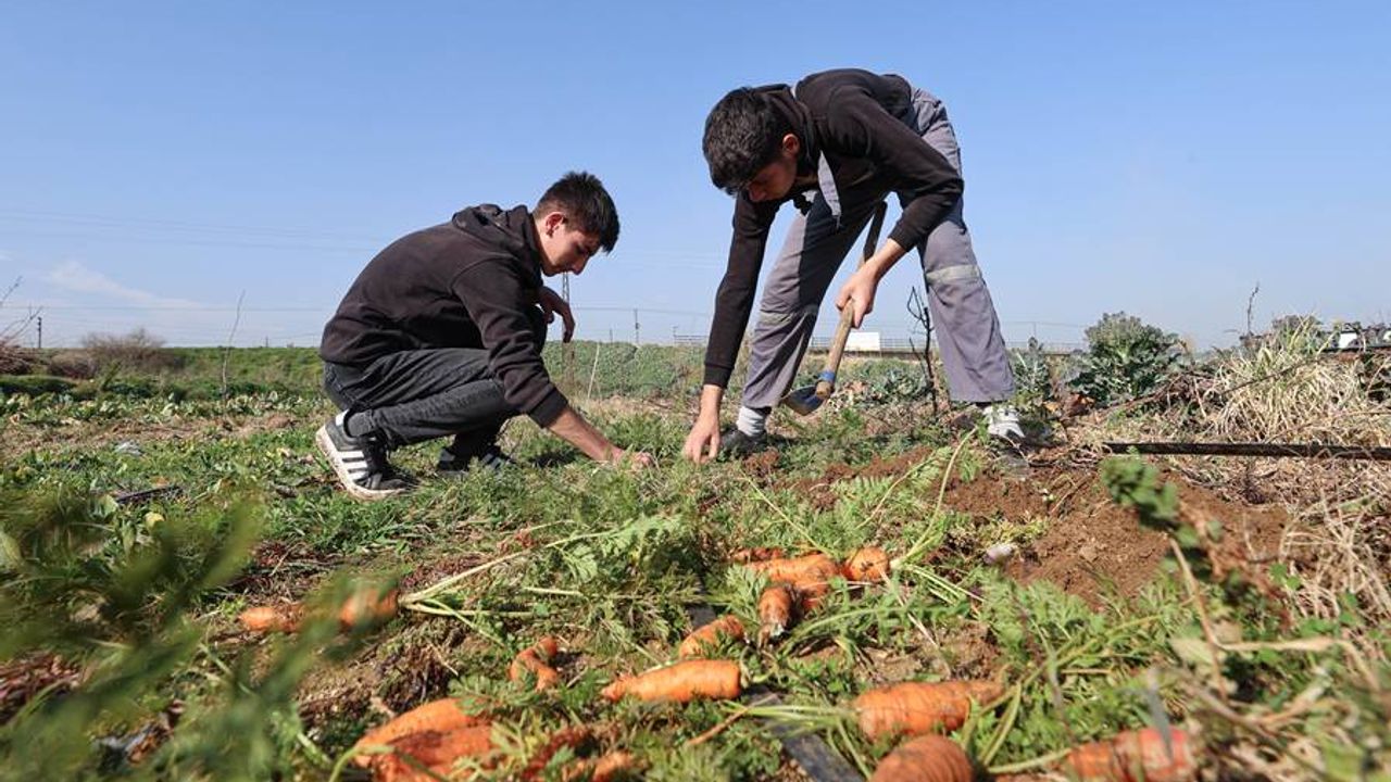 Okula yaklaşık 10 kilometre uzaklıktaki uygulama bahçesinde, öğrenciler sebzelerin bakımını yapıyor ve hasat zamanında ürünleri satışa sunuyor.