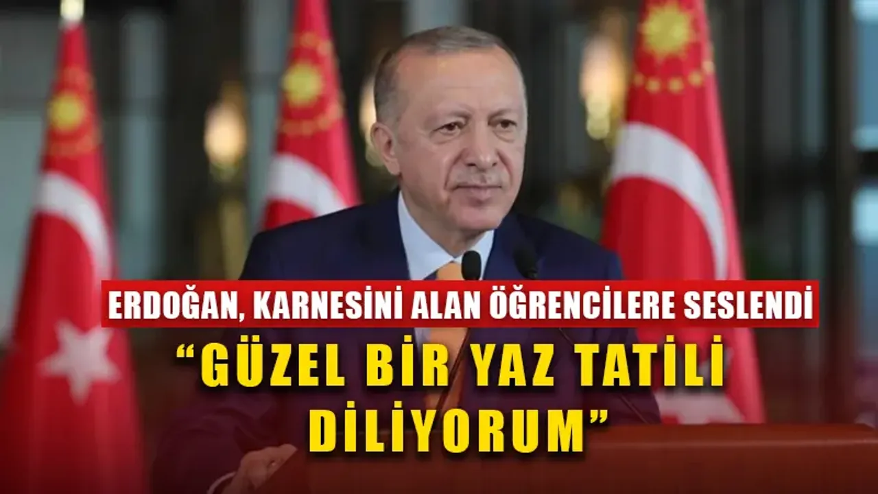 Cumhurbaşkanı Erdoğan: Verimli, güzel bir yaz tatili diliyorum. Cumhurbaşkanı Recep Tayyip Erdoğan, 2023-2024 eğitim öğretim yılının sona ermesiyle birlikte, karne sevinci yaşayan öğrencilere yönelik bir mesaj yayımladı. Erdoğan, sosyal medya hesaplarından paylaştığı mesajda, öğrencilere ve ailelerine güzel bir yaz tatili dileğinde bulundu.