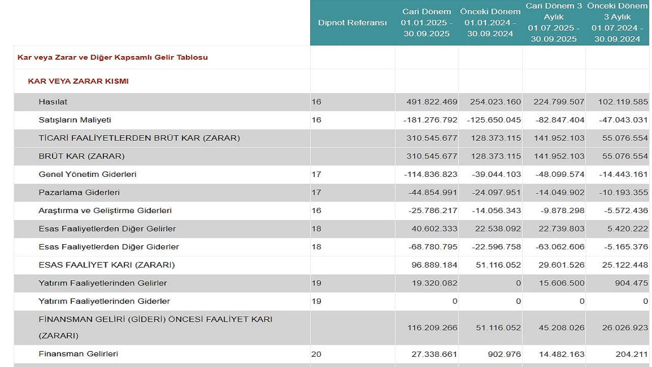 Dof Robotik'in 2025 yılı ilk 9 ayında toplam hasılatı 491,8 milyon lira seviyesinde gerçekleşti. Bu rakam, geçtiğimiz yılın aynı döneminde 254 milyon lira seviyesinde bulunuyordu. Dof Robotik'in esas faaliyet karı da 54 milyon liradan 96,89 milyon TL seviyesine çıktı.