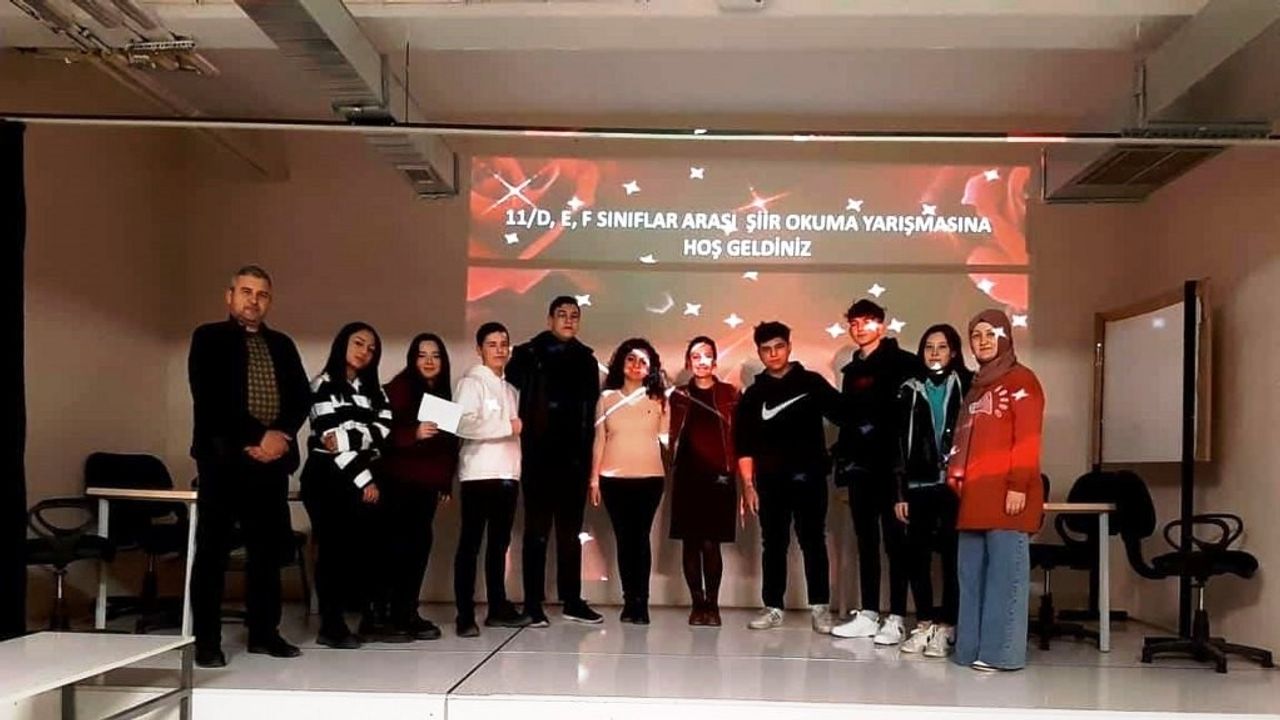 - sınıf Türk Dili ve Edebiyatı dersi konusu olan şiir konusunun daha iyi pekiştirilmesi ve öğrencilerin kendini ifade etmesi, hitabet gücünü ortaya çıkararak güçlendirmesi amacıyla yapılan etkinlikte, öğrenciler öncelikle kendileri sevdikleri şiirleri seçtiler. Vurgu ve tonlama, jest-mimik kullanma, telaffuz, konuya hâkimiyet gibi kriterlere göre öncesinden hazırlık yapan öğrenciler kendi seçtikleri uygun fon müziği ile şiiri bütünleştirerek sahnede jüri ve seyirciler önünde performanslarını sergilediler. Jüri üyeleri öğrencileri değerlendirme formuna göre değerlendirdiler ve en iyi sunum yapan öğrenciyi seçtiler. Birinci olan öğrenci Hayrunnisa Kocaman ödüllendirildi.