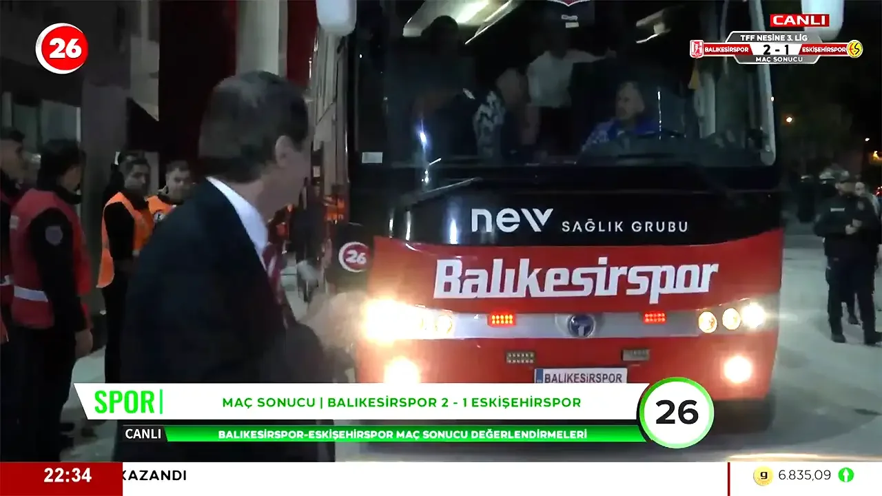 Canlı yayının son dakikalarına doğru arka planda Balıkesirspor takım otobüsü stattan ayrıldığı görülüyor.