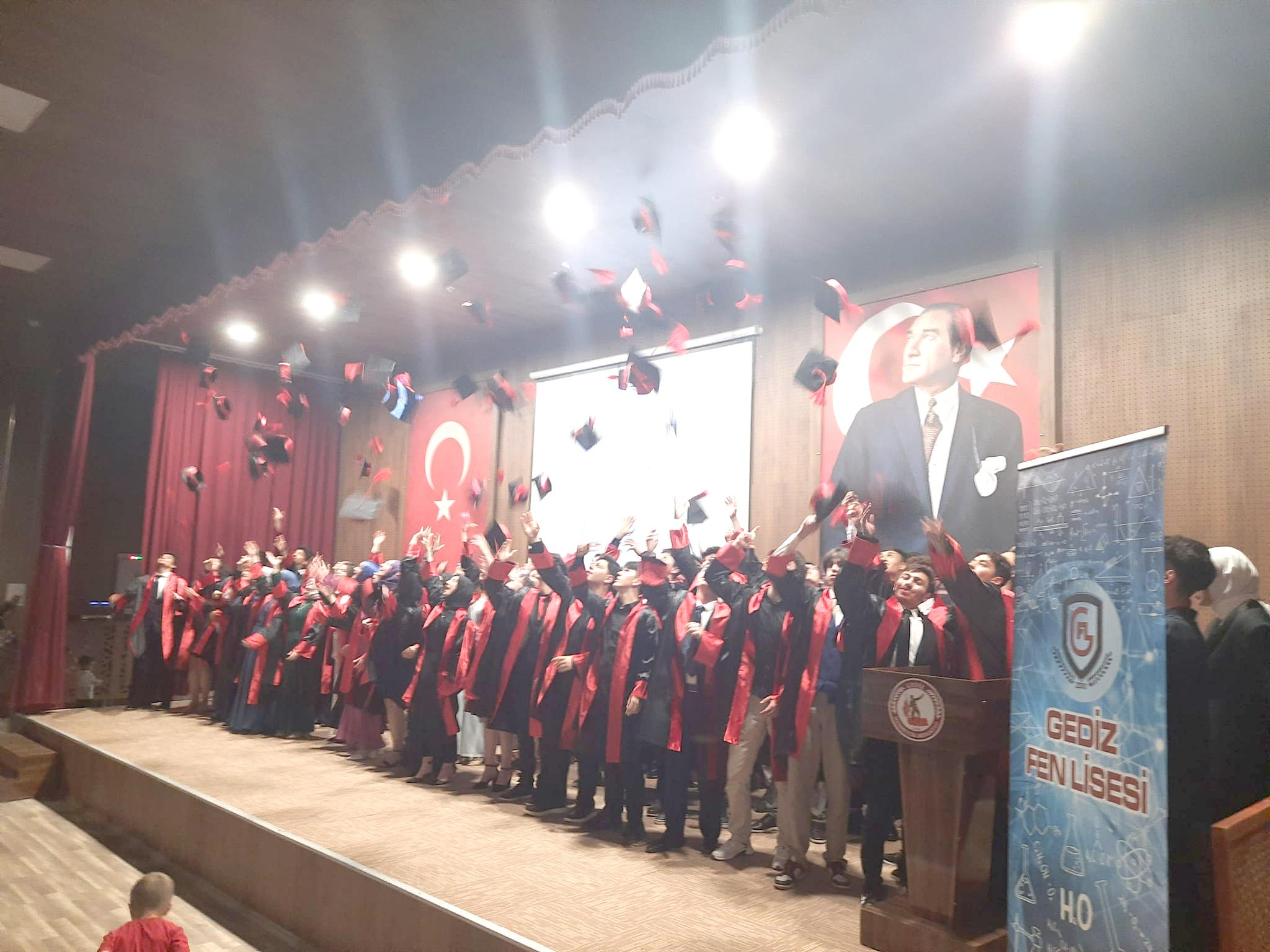 Saygı duruşu ve İstiklal Marşı’nın okunmasıyla başlayan mezuniyet töreni, konuşmalarla devam etti. Gediz Fen Lisesi’nde bu yıl okul birincisi olan Ceyda Yaman, okul ikincisi olan Halil İbrahim Özer, okul üçüncüsü olan Kamil Kanlı'ya ve Matematik Öğretmeni Kürşat Kırmalı'nın ailesine plaket takdim edildi. Tören, müzik dinletisinin ardından öğrencilerin kep atmasıyla son buldu.