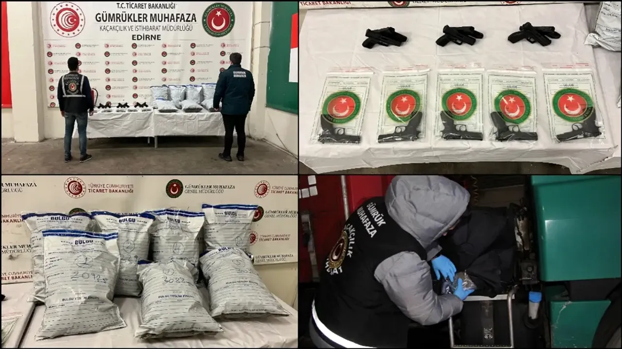 Edirne’nin Kapıkule Sınır Kapısı'nda gerçekleştirilen iki ayrı operasyonda gümrük muhafaza ekipleri, önemli uyuşturucu ve silah kaçakçılığını engelledi. Edirne Gümrük Muhafaza Kaçakçılık ve İstihbarat Müdürlüğü ekiplerinin şüphe üzerine gerçekleştirdiği x-ray taraması ve arama işlemleri sırasında, ruhsatsız tabanca ve uyuşturucu maddeler ele geçirildi.