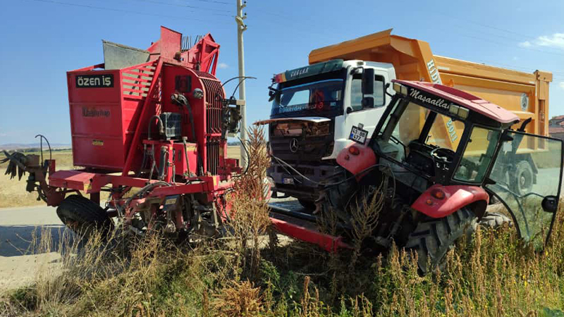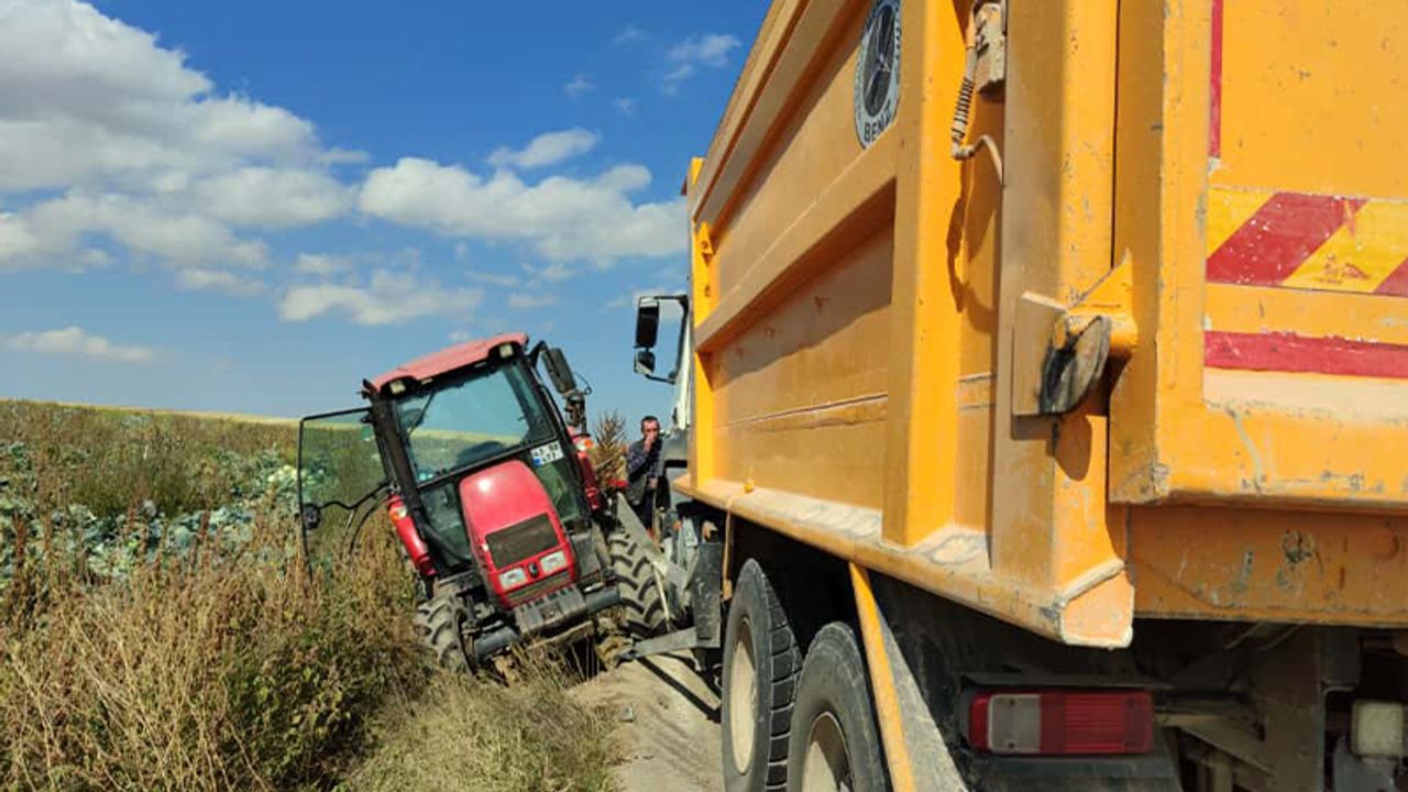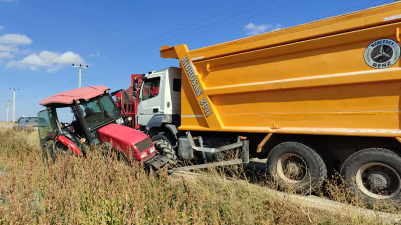 A.A. idaresindeki traktör ile karşı şeritten gelen bir hafriyat kamyonu kafa kafaya çarpıştı.