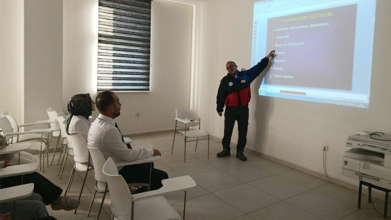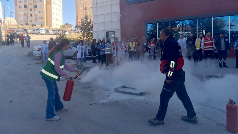 Eğitim sırasında yangının nasıl başladığı, hangi durumlarda nasıl müdahale edilmesi gerektiği ve yangın söndürme cihazlarının doğru kullanımına ilişkin detaylı bilgiler verildi.