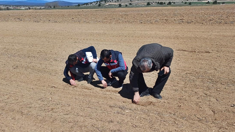 İlçe Müdürü Mücahit Baştürk ve teknik personel, bölgedeki üreticilerin ekim yaptığı alanlarda detaylı incelemelerde bulunarak, don zararının seviyesini yerinde gözlemliyor.