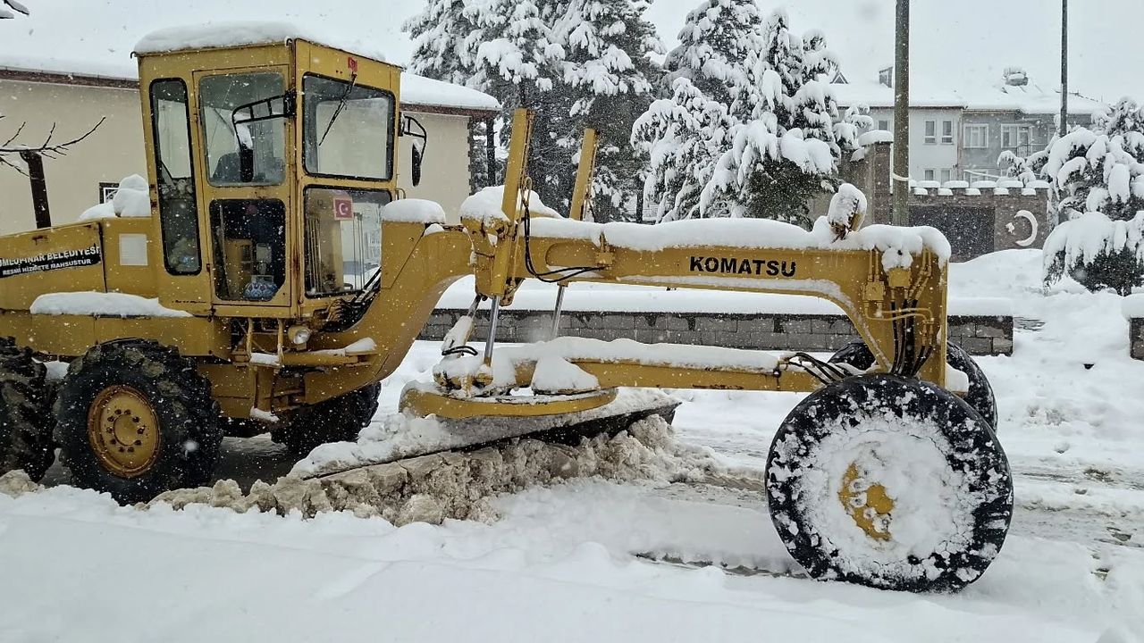 Belediyeye ait greyder ve iki adet kepçe ile cadde ve sokaklarda kar küreme çalışmaları gün boyunca devam ediyor.