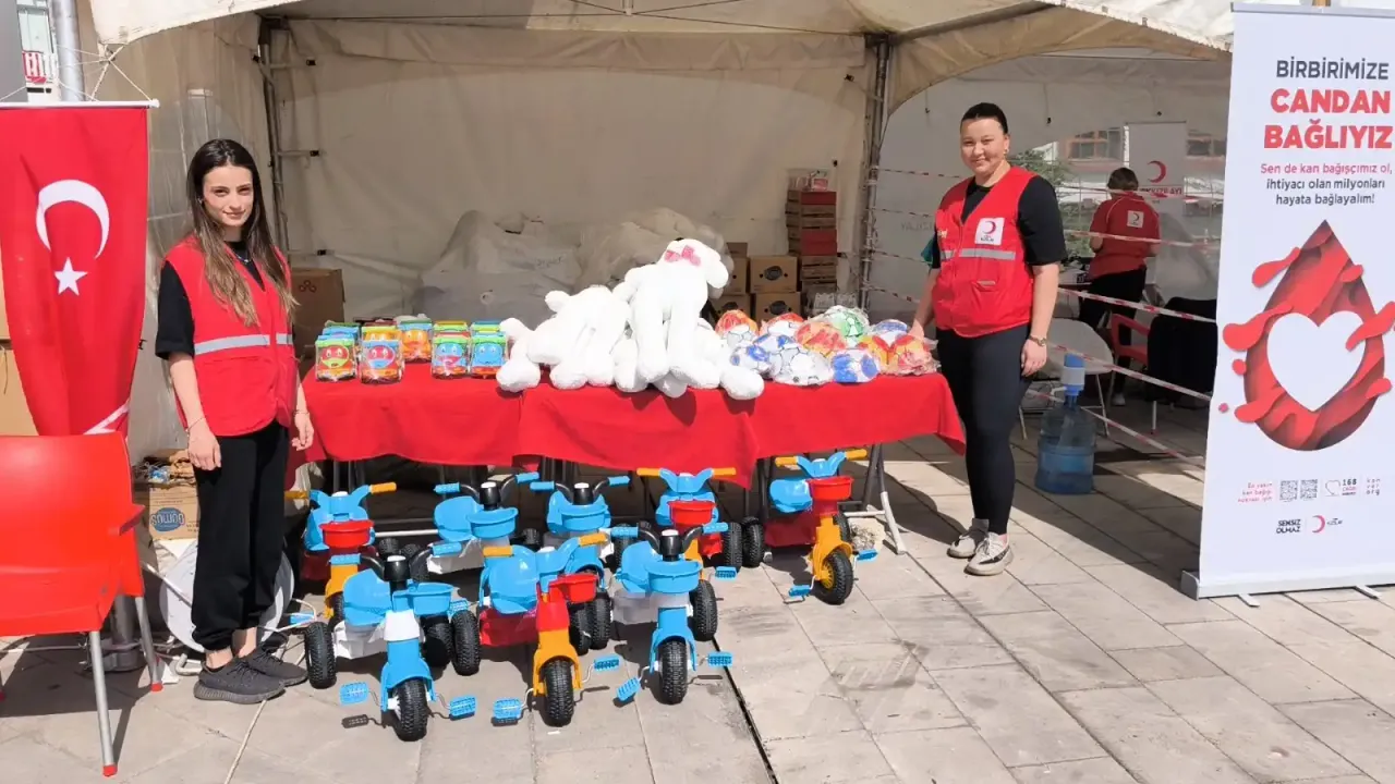 Zafer Meydanı’nda iki gün sürecek kampanyada kan bağışı yapan ailelerin çocuklarına yönelik çeşitli hediyeler veriliyor.