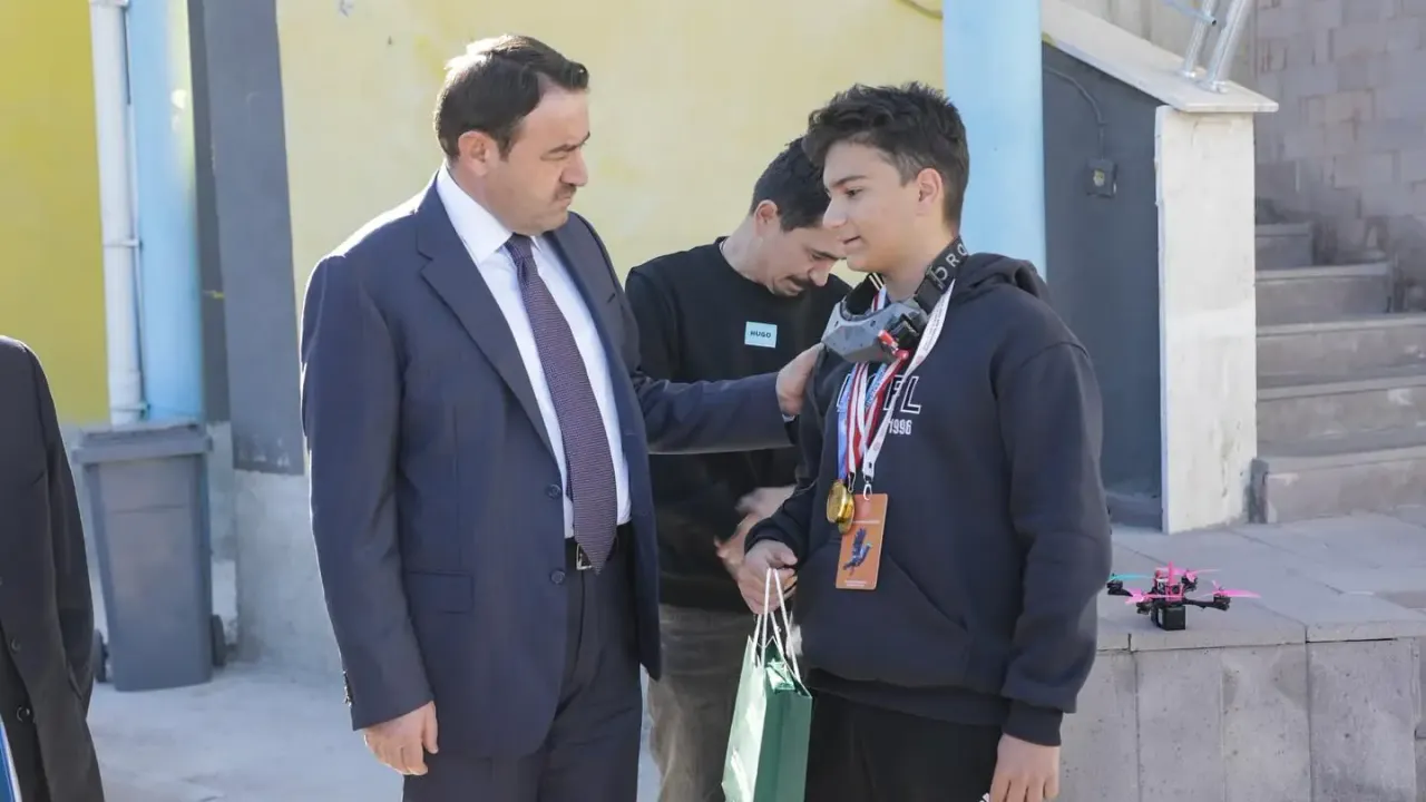 Kütahya Valisi Musa Işın, uluslararası dron yarışmasında dünya birincisi Doruk Cengiz’i okulunda ziyaret etti.