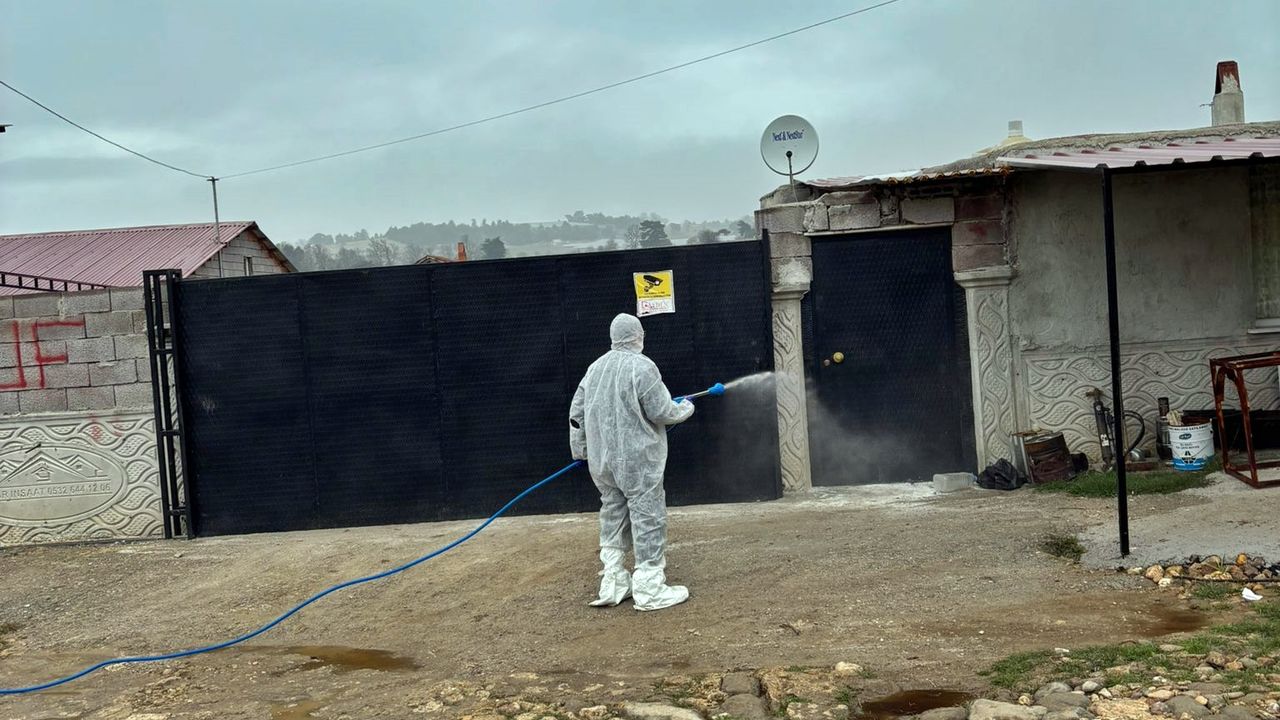 Veteriner hekimler ve teknik personellerin katılımıyla yürütülen uygulamada, hayvan barınakları, ahırlar ve işletme çevreleri uygun dezenfektanlarla temizlendi.