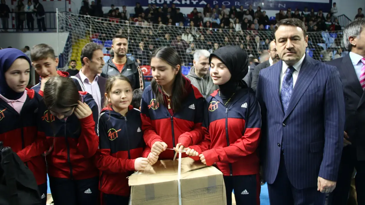 Dumlupınar Spor Salonu’nda düzenlenen törende müsabakalara katılım oranlarına göre, belirlenen 56 okula malzemeleri teslim edildi.