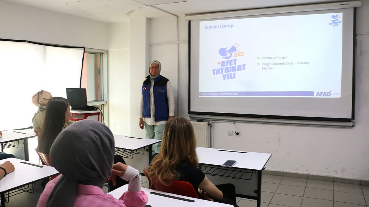 Kurum binasında gerçekleştirilen eğitimde Afet ve Acil Durum Yönetimi Başkanlığı (AFAD) ekipleri, öğrencilere ve öğretmenlere yangın anında yapılması gerekenler konusunda eğitim verdi.