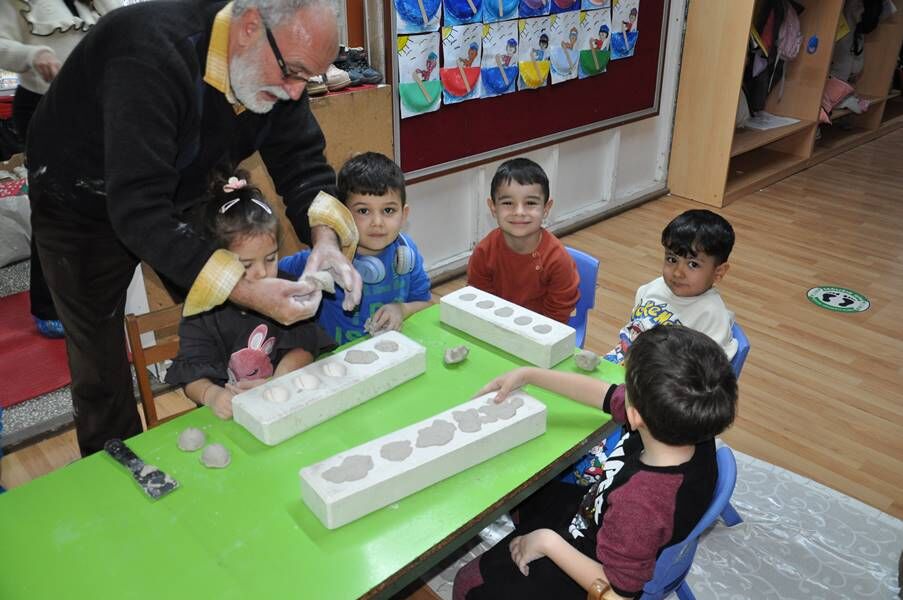 Anaokulu öğrencileri, çini çamurunu işleyerek uğur böceği, kelebek, fil, lale ve kase gibi farklı objeler oluşturdu.
