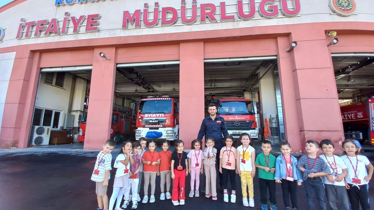 İtfaiyeci abi ve ablaları ile temsili ateş söndüren minikler, itfaiyecilik mesleğinin önemini öğrendi.
