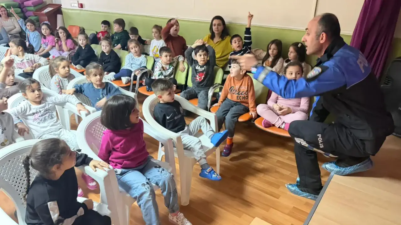 Bu çerçevede kent merkezinde okullarda öğrencilerle bir araya gelen polis ekipleri, Hediye Güral Anaokulu’nda eğitim gerçekleştirdi.