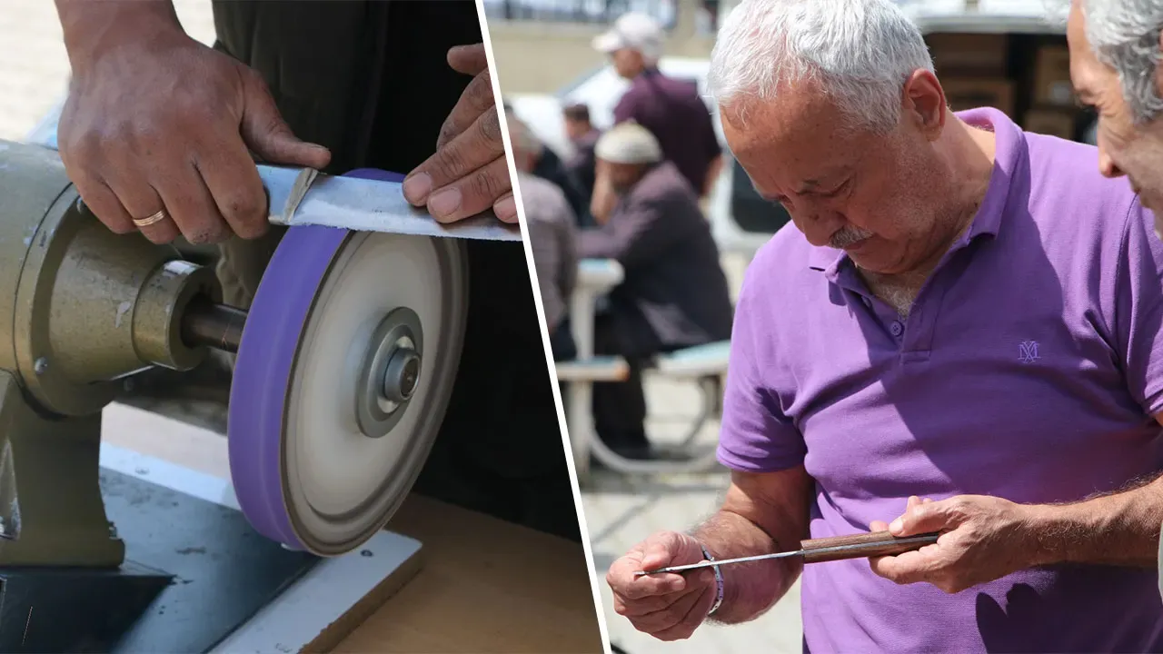 Kurban Bayramı’na kısa bir süre kala her meslekten insanın bıçakçı olduğunu vurgulayan İşlek, “Herkes bıçağı taş ile bileyliyor. Biz taşı sürmeyiz bıçağa. Taşa bıçak sürdüğümüz zaman bıçağın suyunu kaçırır. Bıçağı öldürür taş. Biz ise bir tarafta zımpara diğer tarafta deri ile yapıyoruz.” diye konuştu.