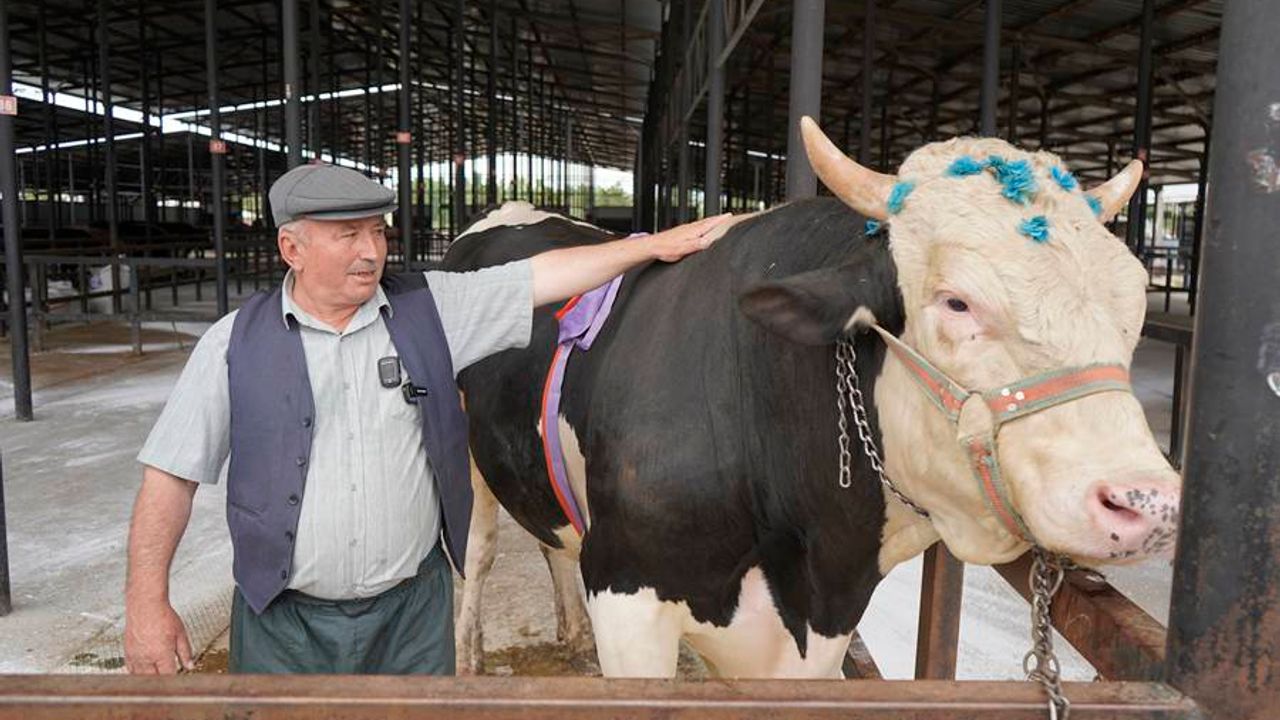 Kentte besicilik yapan Ali Mercan, besihanesinde yetiştirdiği tosununu canlı hayvan pazarında beğeniye sundu.