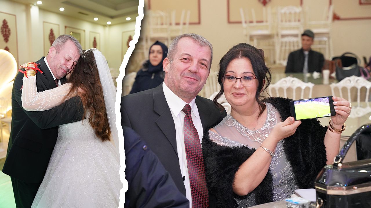 İlçedeki bir düğün salonunda hayatlarını birleştiren Ceren-Kasım çiftinin düğününde futbol heyecanına “dur” diyemeyen gelinin babası Mustafa Yenişah, 14 Şubat’ta oynanan Trabzonspor-Fenerbahçe derbisini cep telefonundan takip etti.