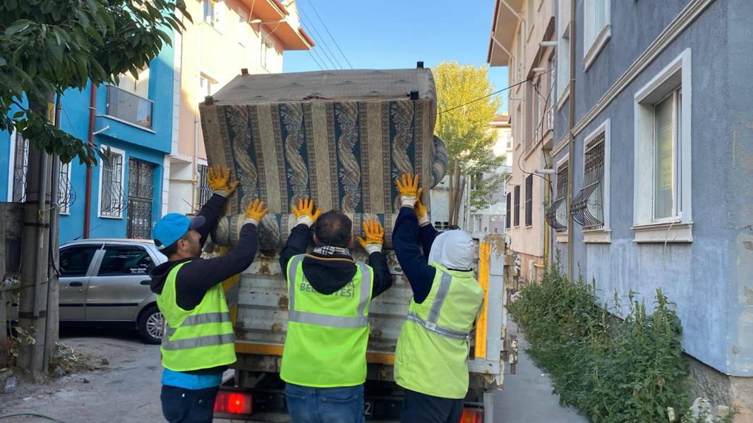 Çöp konteynerlerinin bulunduğu alana bırakılan kullanılmayan eşyaları da toplayan ekipler, sokak aralarındaki birikintileri topladı.