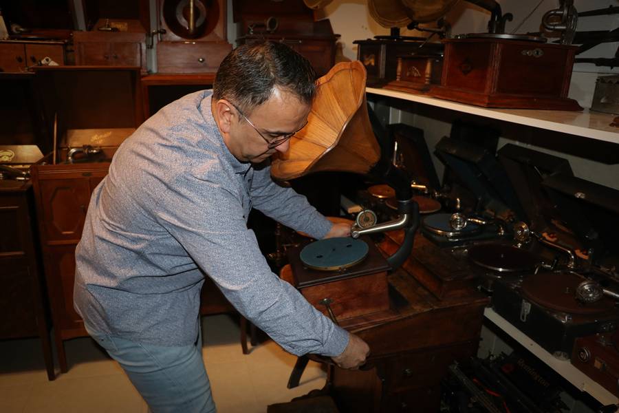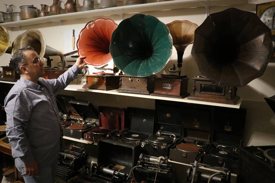 Bahçelievler Mahallesi’nde yaşayan 46 yaşındaki Tanrıkulu, çok sayıda gramofon, fonograf ve laternayı evinin bir odasında sergiliyor.