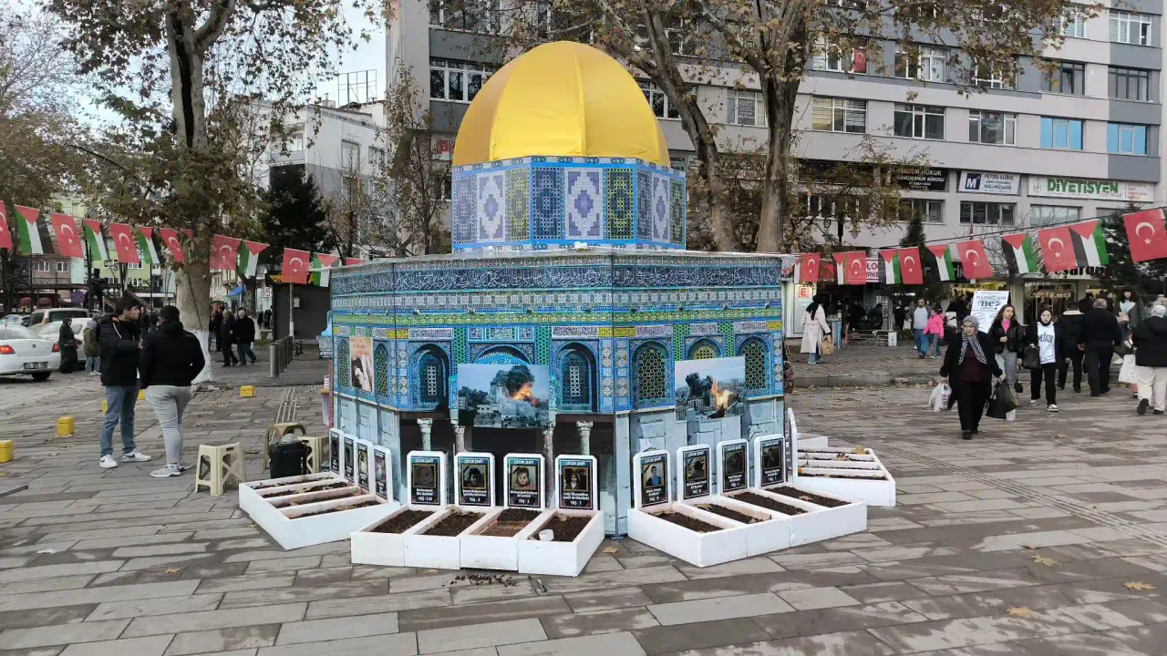 Kütahya’da Filistin’de yaşanan zulme dikkat çekmek için Mescidi Aksa maketi ve temsili çocuk mezarları Zafer Meydanı’nda yerini aldı.