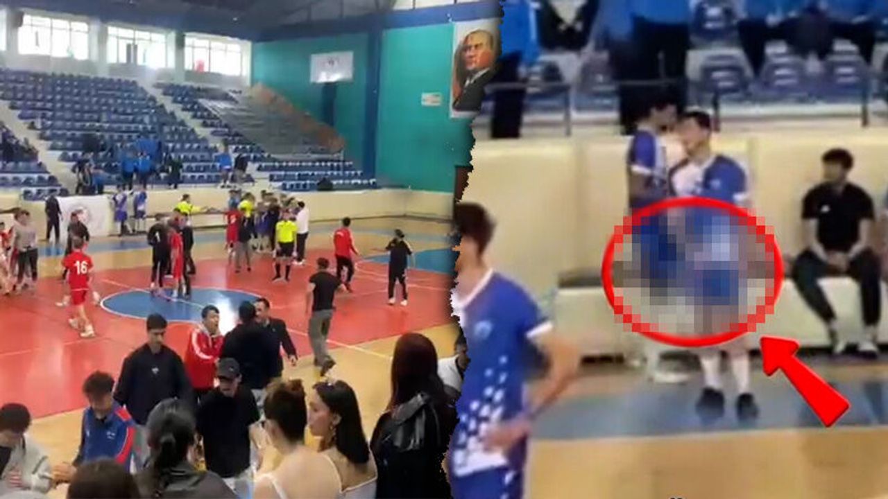 Görüntülerde, Afyon Kocatepe Üniversitesi futsal takımından bir oyuncunun kadın öğretmen ve öğrencilere yaptığı gayri ahlaki davranış kameralara yansıyor.