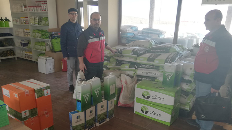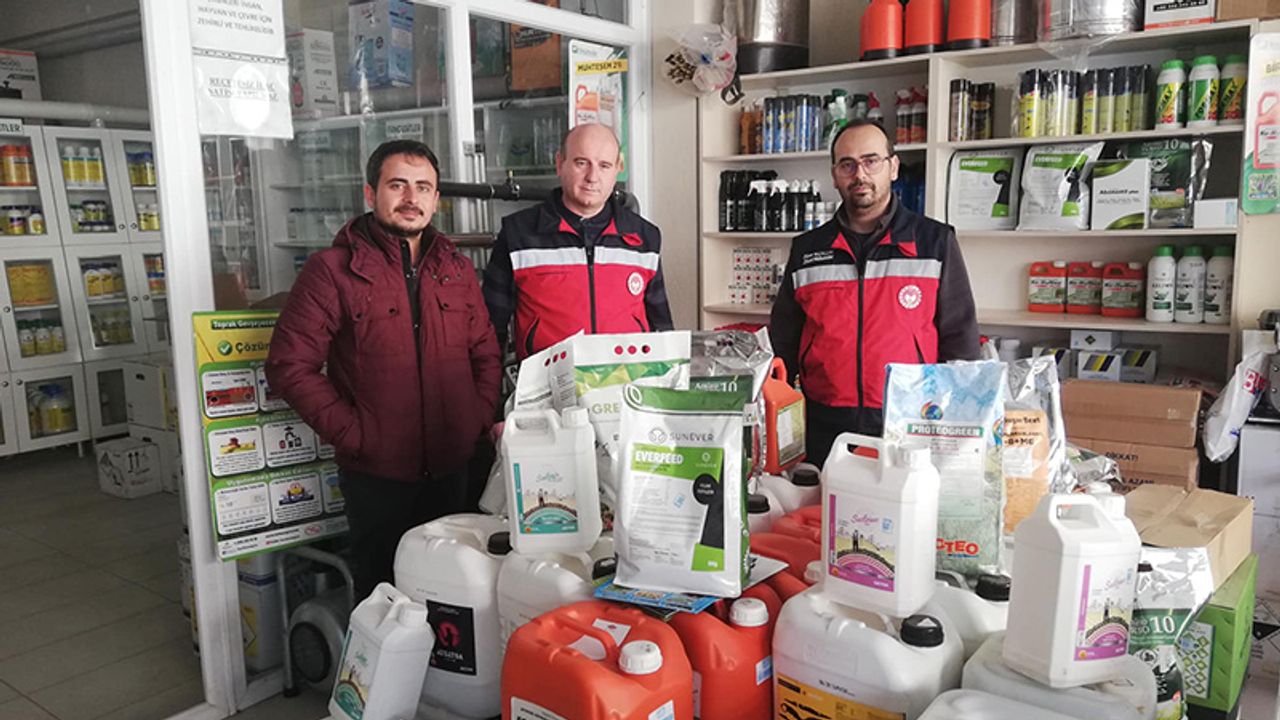 Denetimler kapsamında gübre dağıtıcı bayilerinde yapılan incelemelerde depo kontrolleri gerçekleştirilirken, 80 adet katı ve sıvı gübre üzerinde etiket ve stok denetimi yapıldı.
