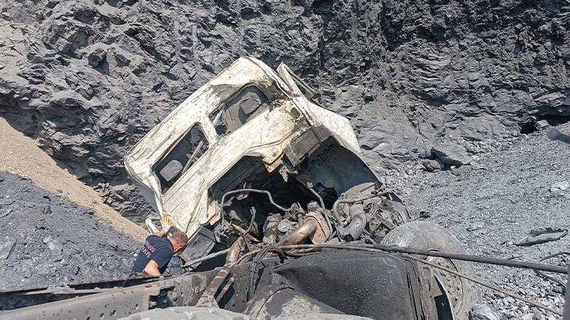 Alınan bilgiye göre, Oysu köyü yakınlarındaki grafit maden ocağında Üzeyir Kılıç'ın (54) kullandığı hafriyat yüklü kamyon, döküm yaptığı sırada yaklaşık 15 metrelik uçuruma devrildi.