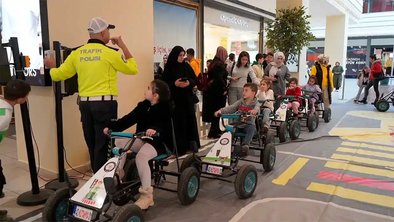 Alışveriş merkezinde kurulan eğitim parkurunda öğrencilere, emniyet kemeri, yaya geçidi, trafik ışıkları ile ilgili bilgi verildi.