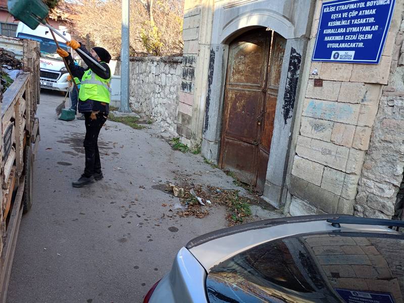 Temizlik ekipleri kilisenin etrafında biriken çöpleri topladı, kaldırım ve yol kenarlarında detaylı temizlik yaptı.