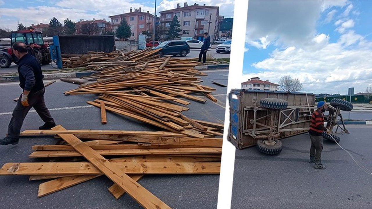Sürücüsünün ismi henüz belirlenemeyen traktöre bağlı kereste yüklü römork, kavşakta dönüş yaptığı sırada devrildi.