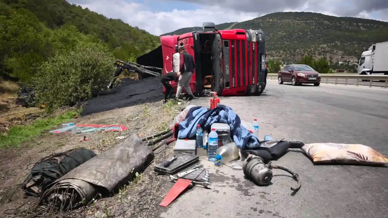 Mehmet Y. idaresindeki 06 CRC 248 plakalı kömür yüklü tır, Kütahya-Eskişehir kara yolunun 19. kilometresinde sürücünün direksiyon hakimiyetini kaybetmesi sonucu savrularak devrildi.