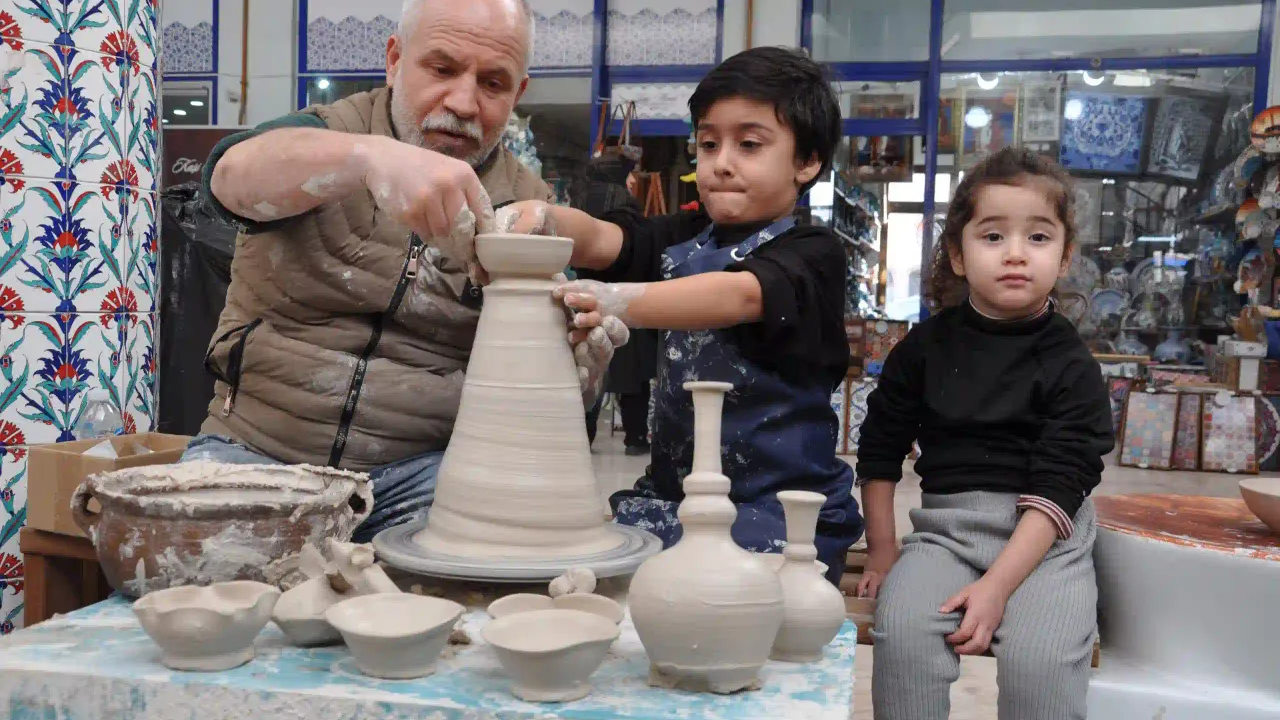 Etkinlik kapsamında çocuklar çini çamuruna şekil verirken, çamurdan objeler yaparak yeteneklerini sergiledi.