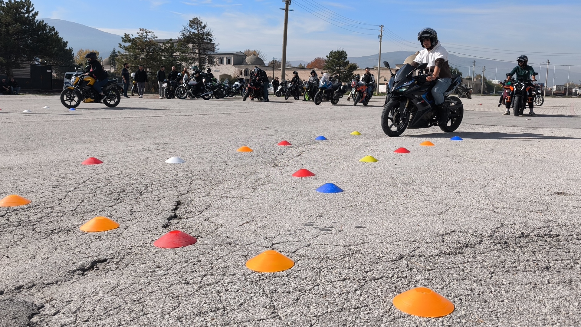 Yaklaşık 50 motosiklet sücüsünün katıldığı eğitimde motosikletlilerin yanı sıra scoter ve kadın motosikletliler de kendi arasında ayrıldı.