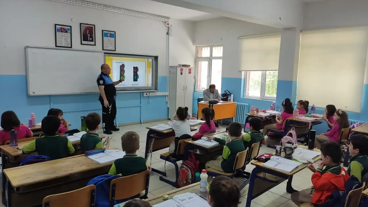 Kütahya’da polis ekipleri tarafından ilkokul öğrencilerine basit trafik kuralları anlatıldı, 112 Acil Çağrı numarası tanıtıldı.