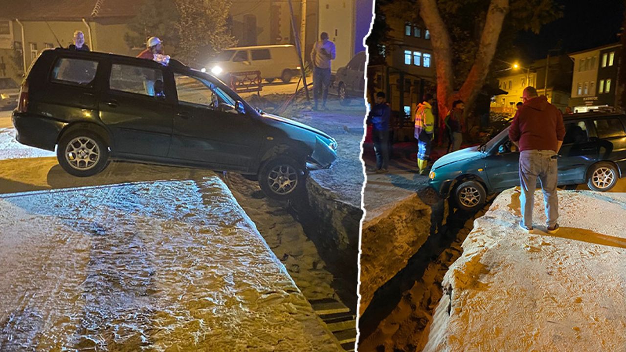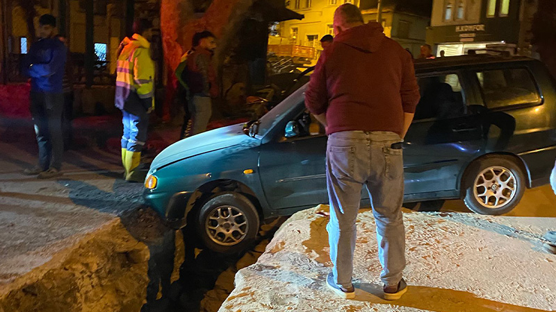 T.C. idaresindeki otomobil, kentte faaliyet gösteren elektrik firmasının caddeye elektrik panosu yerleştirmek için başlattığı kazdığı alana girdi.