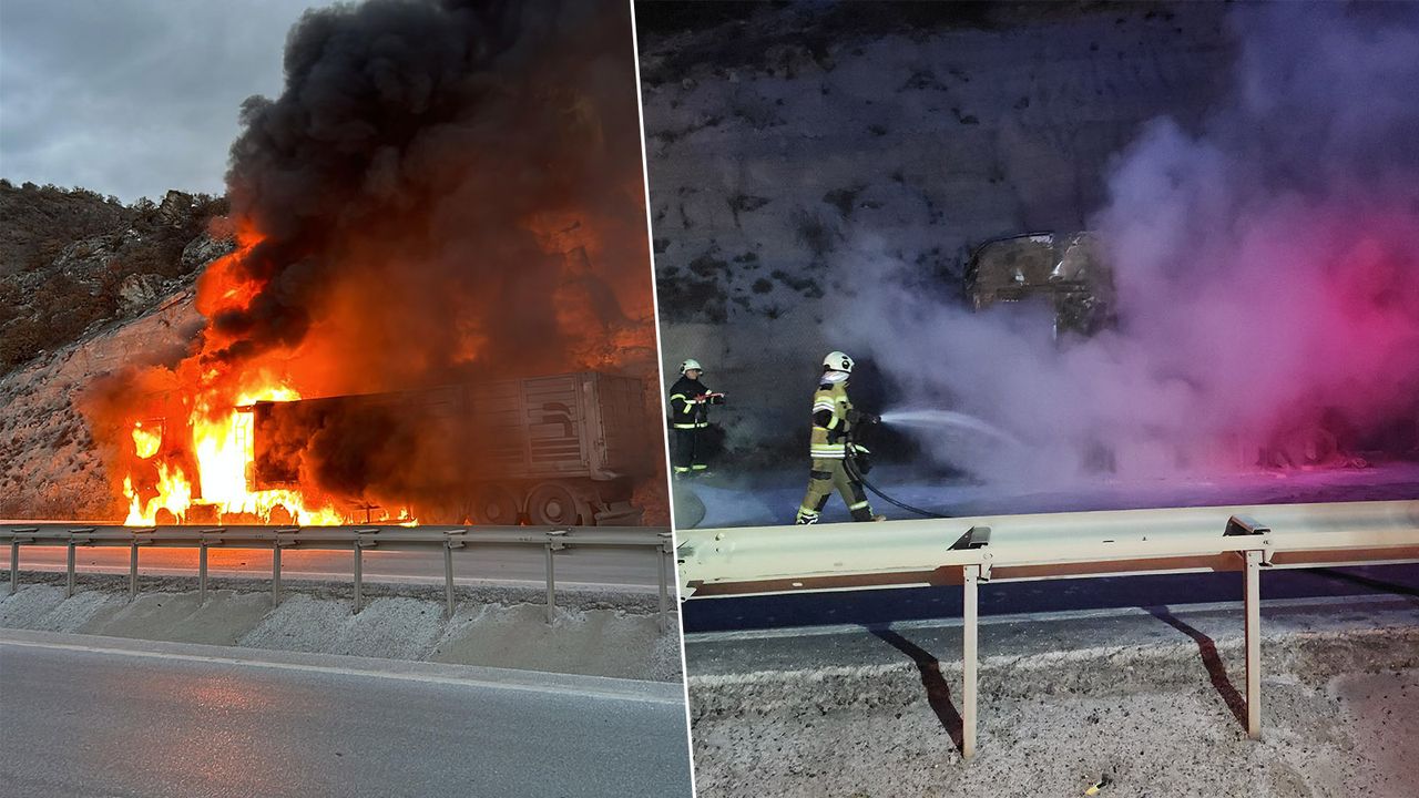 Tır yangını nedeniyle trafik bir süre kontrollü olarak tek şeritten sağlandı.