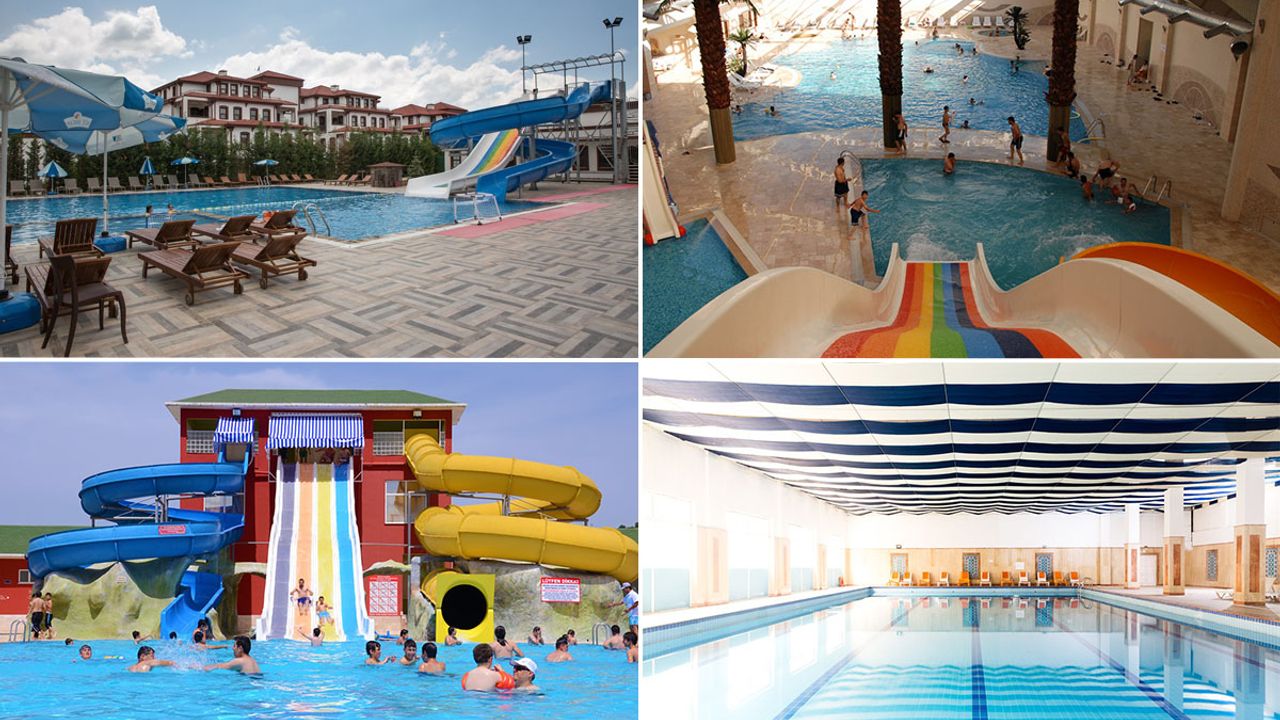 Konaklama: Otel, apart daireler, açık havuz, aquapark ve hamamlar.