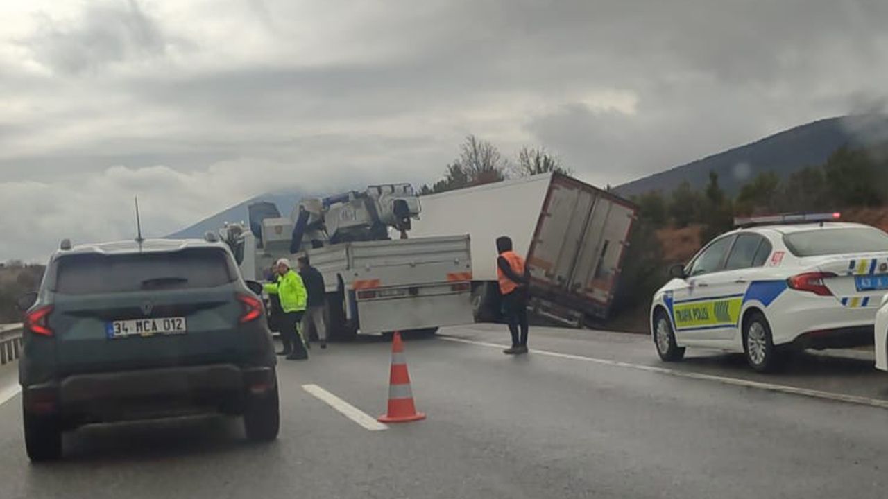 İsmi ve plakası henüz öğrenilemeyen tır, sürücüsünün direksiyon hakimiyetini kaybetmesiyle yol kenarına savruldu.