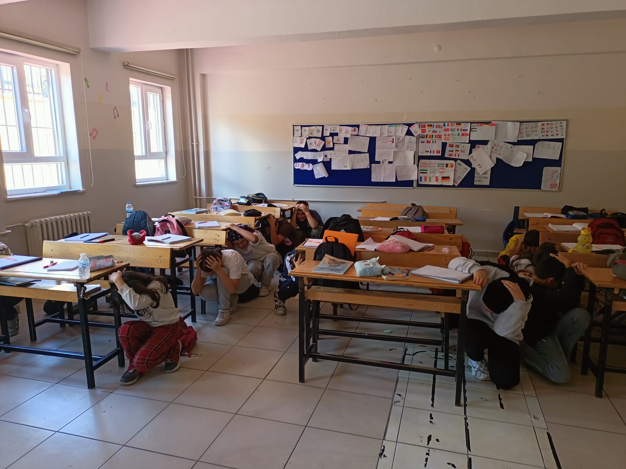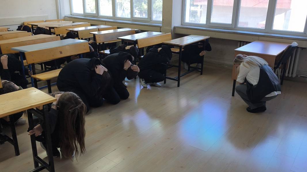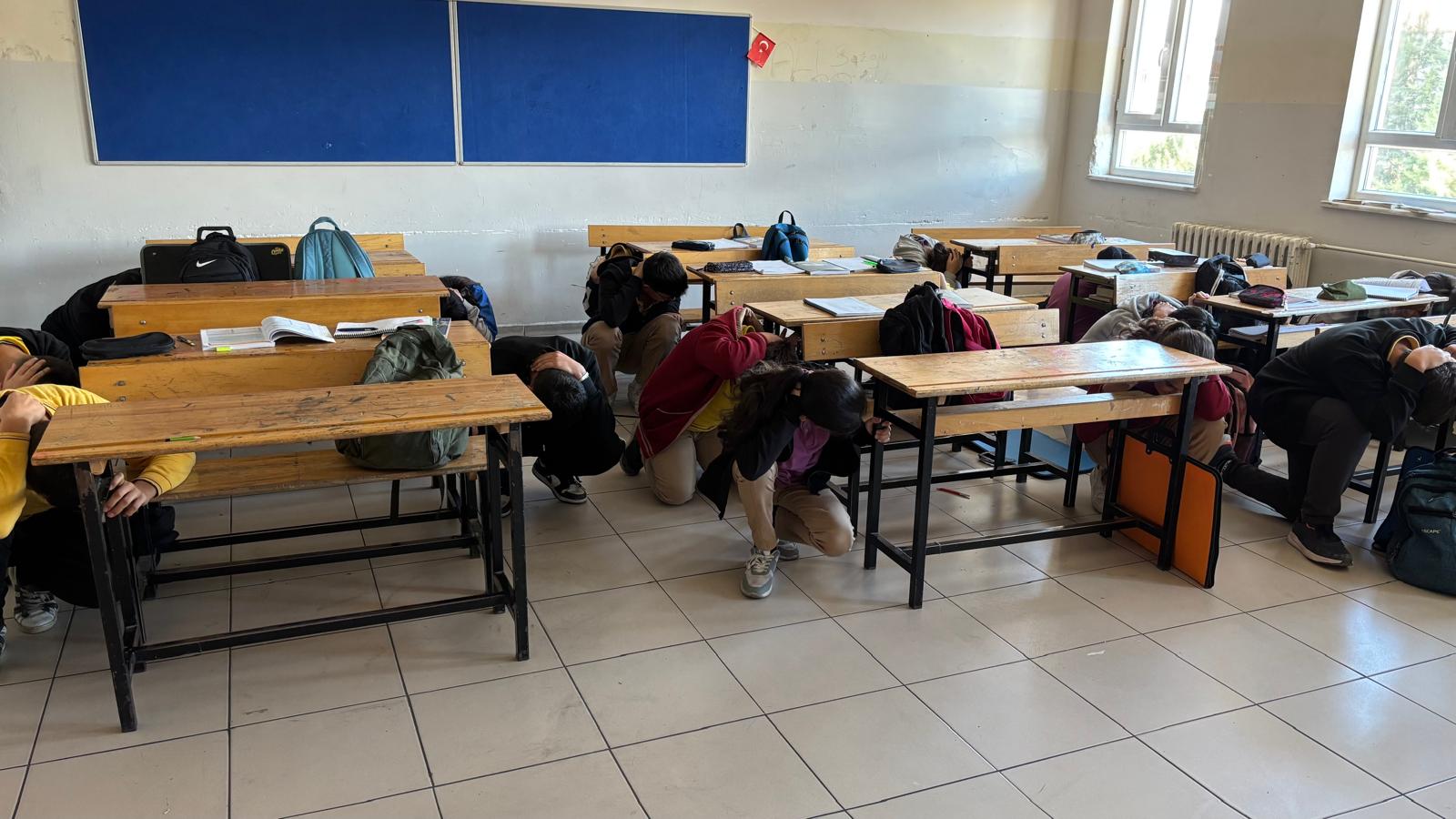 Sirenlerin çalmasıyla öğrenciler çök kapan tut hareketini gerçekleştirdi ve ikinci sirenin çalmasını bekledi.