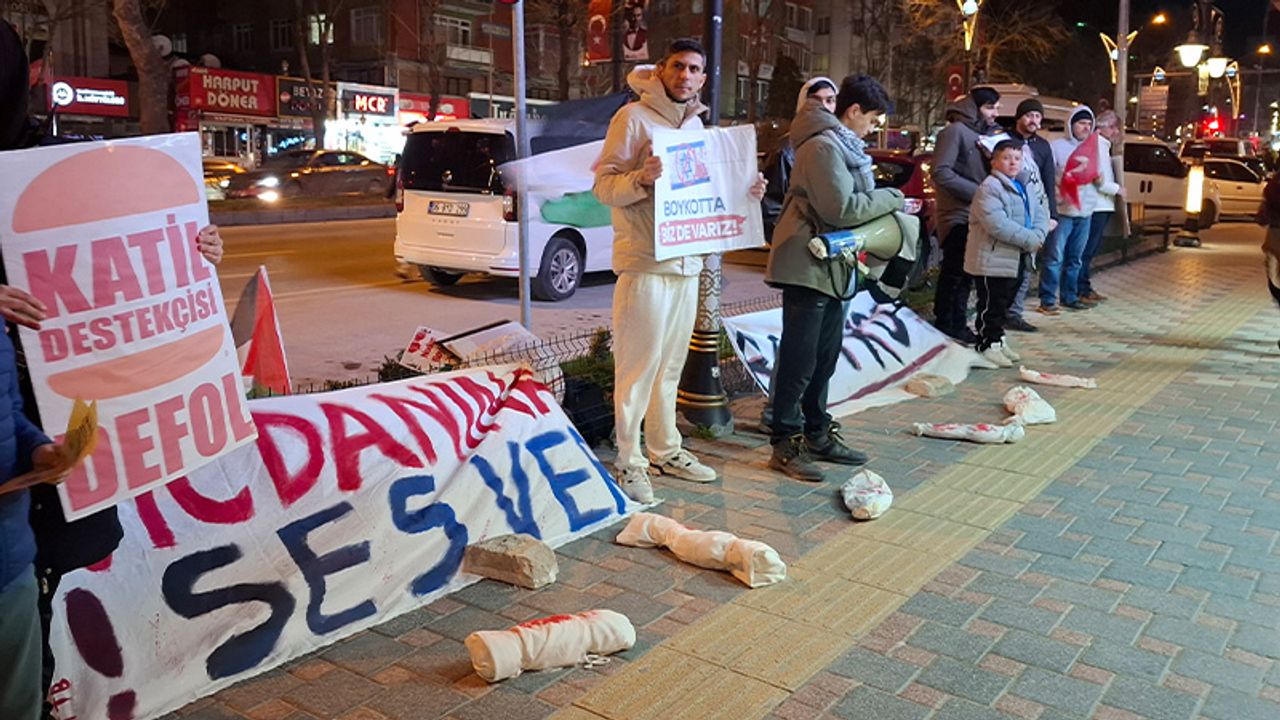 “Müslüman uyuma kardeşine sahip çık” “Katil Burger King mahallemden defol” sloganları atan grup adına yapılan açıklamada, firmanın İsrail’e maddi ve siyasi destek verdiği vurgulandı.
