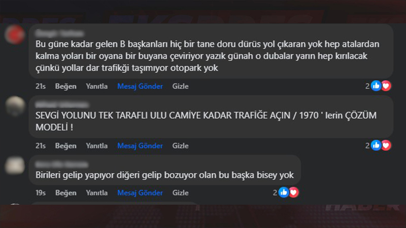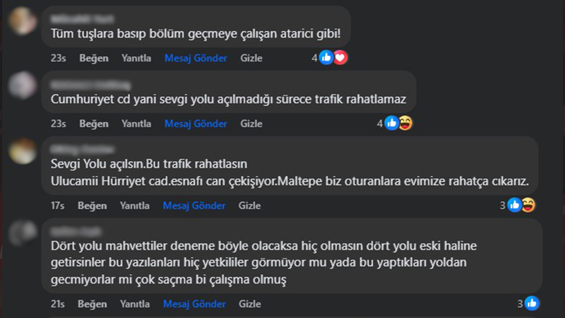 Caddede hayata geçirilen yeni uygulamanın gereksiz olduğu görüşünde birleşen vatandaşlar, “Tüm tuşlara basıp bölüm geçmeye çalışan atarici gibi!”, “Dörtyolu mahvettiler deneme böyle olacaksa hiç olmasın. Dörtyolu eski haline getirsinler. Bu yazılanları hiç yetkililer görmüyor mu? Ya da bu yaptıkları yoldan geçmiyorlar mı? Çok saçma bir çalışma olmuş”, “Nasıl kaza çıkartırız çalışmasının örneği”, “Demek ki yeni sıkıntılar bizi bekliyor. Hadi geçmiş ola” yorumu yaptı.